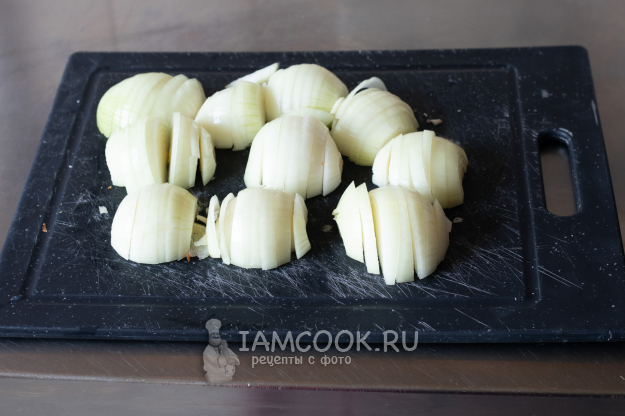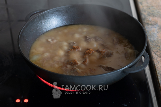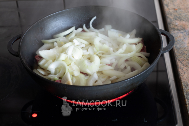 Когда лук будет порезан, поместим его поверх мяса. За те 10 минут, пока всё это дело варится на сильном огне, его нужно разок-другой промешать.