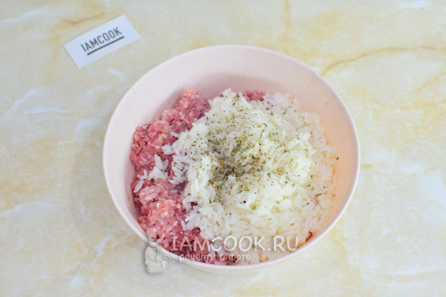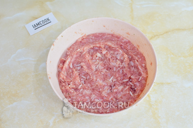Мясо пропустите через мясорубку и соедините с отварным рисом. По вкусу добавьте соль и специи.
