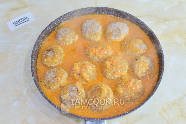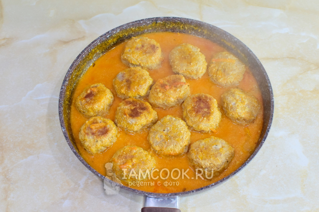 Готовым соусом залейте тефтели и тушите их на небольшом огне 15-20 минут. Периодически их поворачивайте для равномерного приготовления.