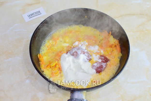 Затем добавьте сметану и томатную пасту. Подлейте горячую воду. Все смешайте и доведите до кипения.