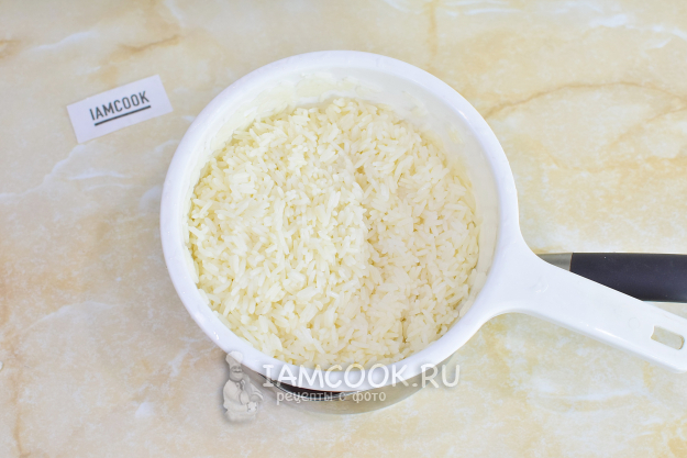 Рис отварите в кипящей воде 12-15 минут, до мягкости. Затем откиньте его на дуршлаг и пролейте холодной водой.