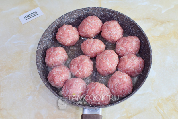 На горячую сковороду налейте немного растительного масла. Сформируйте руками тефтели и выложите их в сковороду. Обжарьте со всех сторон до изменения цвета.