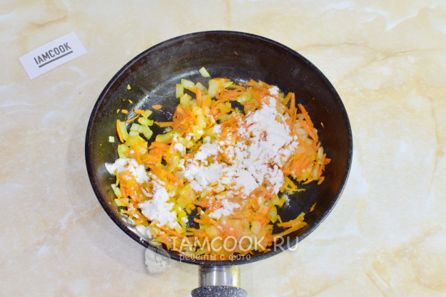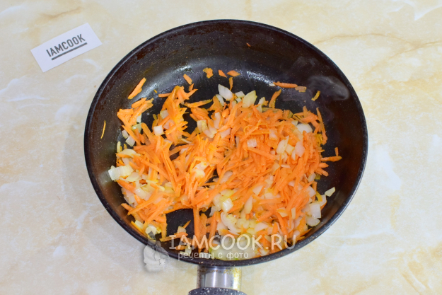 В другой сковороде обжарьте измельченные овощи 1-2 минуты (лук мелко нарежьте, а морковь потрите на терке).