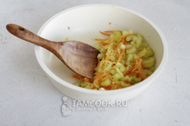 Разогрейте сковороду с маслом и слегка обжарьте лук с морковью. Лук должен быть полупрозрачным, а морковь - мягкой.