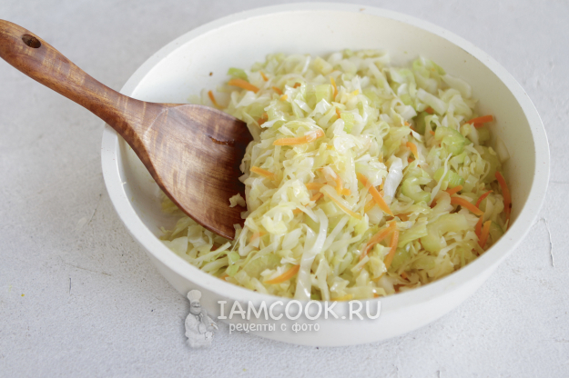 Не убавляя огонь, продолжайте обжаривать овощи помешивая. Сковорода у меня небольшая в диаметре, поэтому капусту я добавляла в 2 захода. Как только капуста начала изменяться в объеме, я добавила вторую часть.