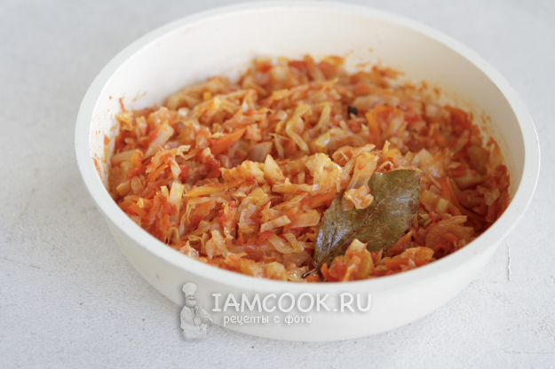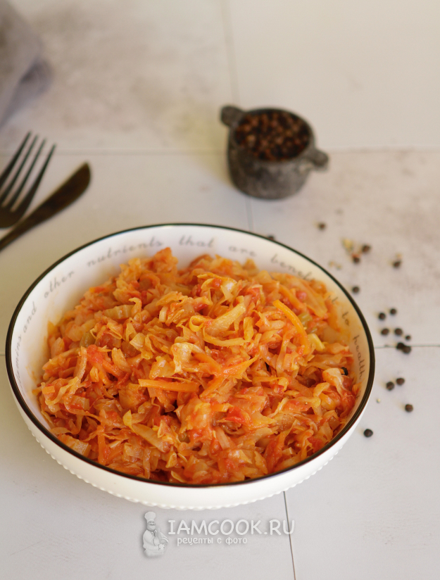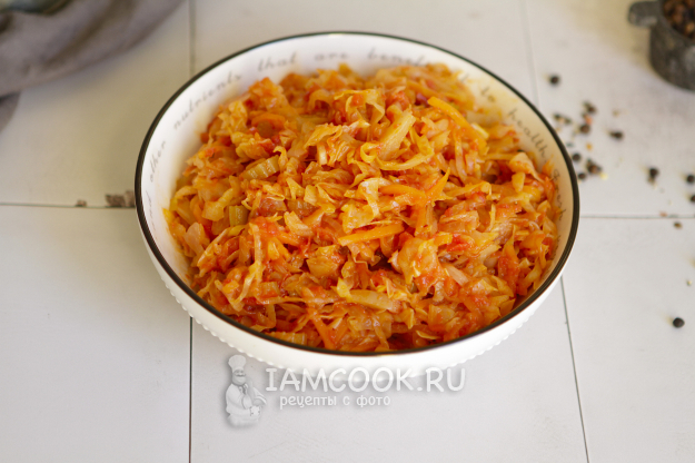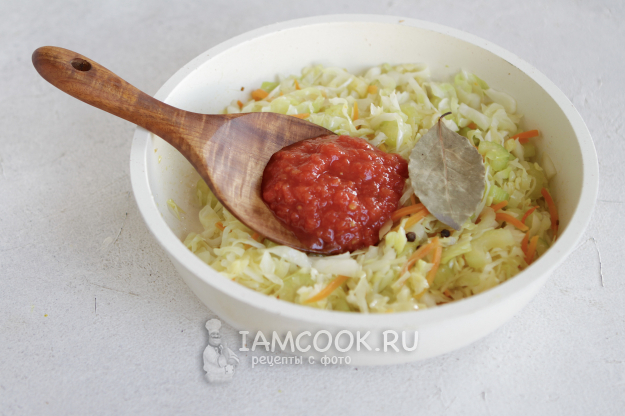Перед добавлением перетертых томатов, капуста должна хорошо зажариться, поэтому не торопимся.