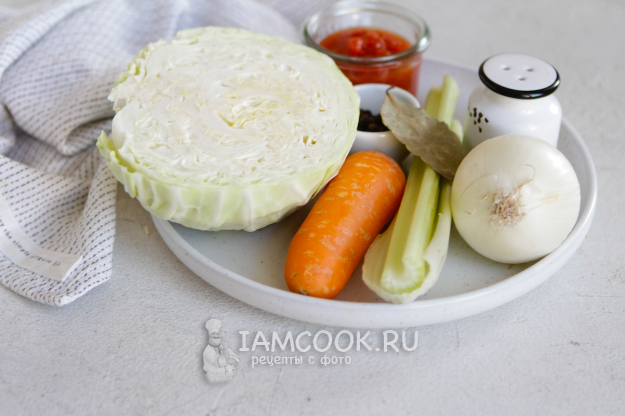 Соберите все ингредиенты по списку и приступим к приготовлению тушеной капусты с сельдереем. Помойте и почистите все овощи. Верхние листья капусты снимите, разрежьте пополам и удалите кочерыжку.