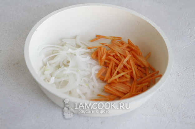 Лук репчатый нарежьте произвольно. Морковь нарежьте мелкой соломкой.