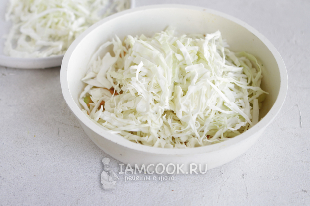 Капусту нашинкуйте соломкой и добавьте в сковороду к овощам.