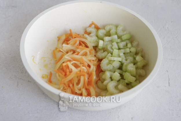 Стебли сельдерея нарежьте произвольно и добавьте к овощам.