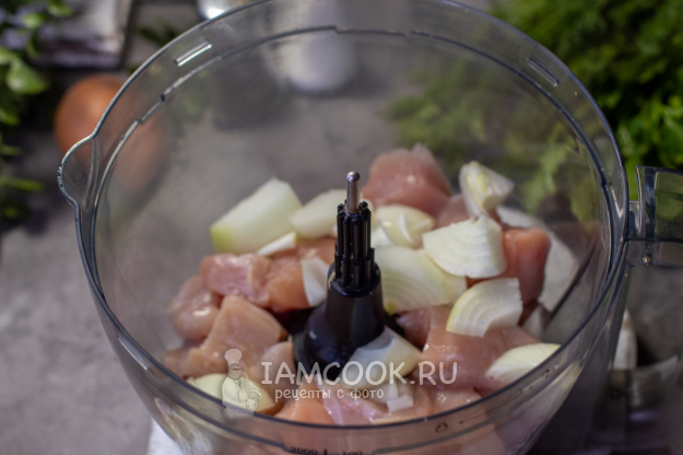 Куриное филе помойте и обсушите. Лук очистите. Нарежьте филе и лук небольшими кусочками и сложите в чашу измельчителя. Также можно воспользоваться мясорубкой. Измельчите курицу с луком в фарш.
