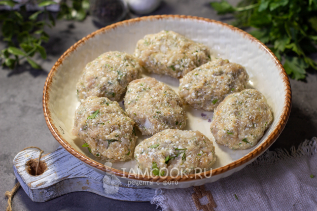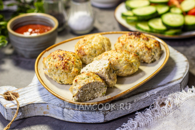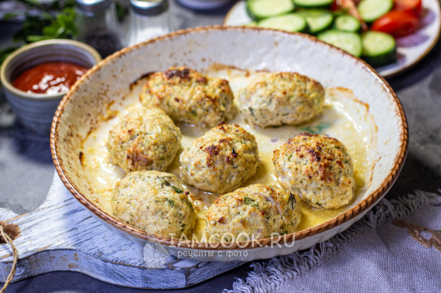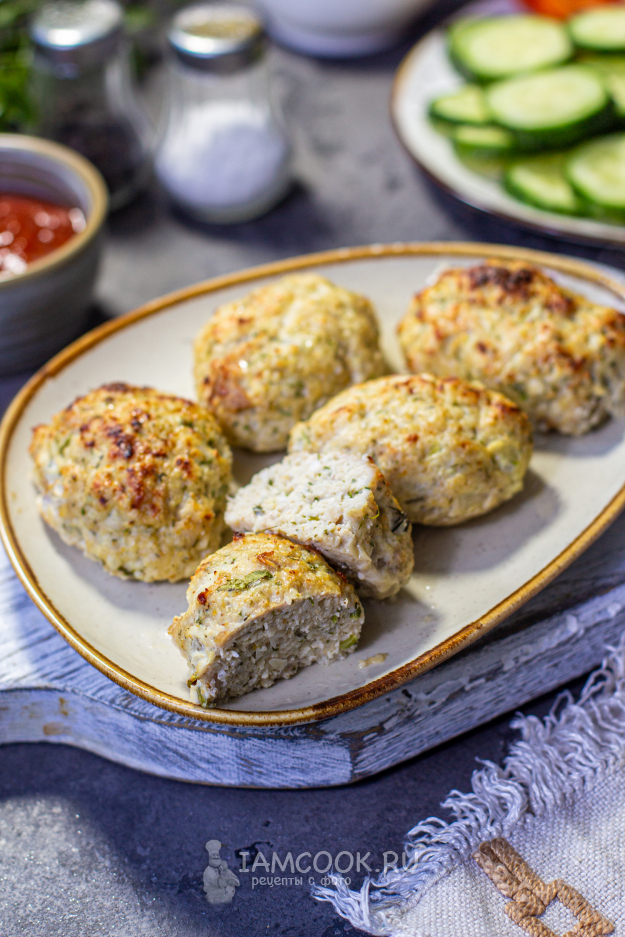 Слегка влажными руками сформируйте котлеты, переложите в слегка смазанную форму для выпечки. Запекайте куриные котлеты с творогом в духовке, заранее разогретой до 200 градусов, 25-30 минут при режиме "Низ-Верх". Последние 5 минут я допекала котлеты при режиме "Верхний Гриль".