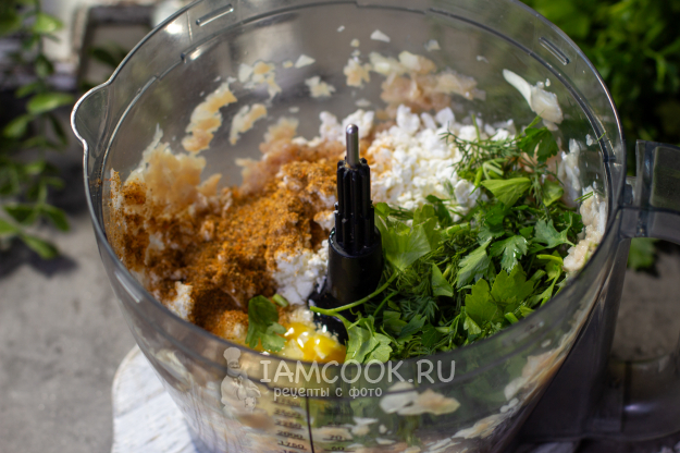 К фаршу добавьте творог, куриное яйцо, зелень, специи для котлет.