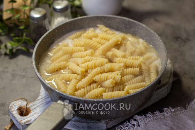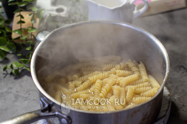 К этому времени у вас должны быть готовы макароны. Для того чтобы отварить макароны, вскипятите в кастрюле два литра воды, посолите ее и добавьте макароны, сразу перемешайте. Убавьте нагрев и варите макароны согласно инструкции, указанной у вас на упаковке. У меня на упаковке указано время приготовления - 8 минут. Я варила их ровно 7 минут, так как они "дойдут" в соусе.