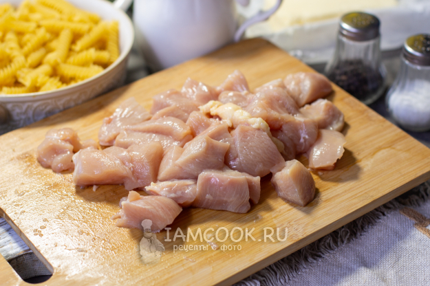Куриное филе помойте и обсушите. Нарежьте небольшими кусочками.
