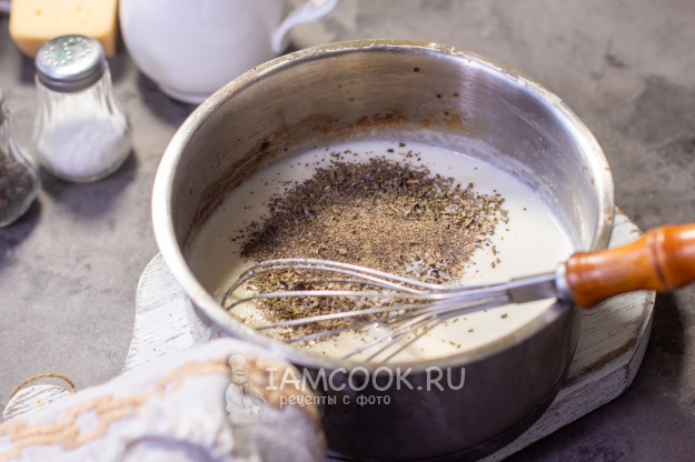 В сотейник к маслу с мукой тонкой струйкой влейте молоко, при постоянном помешивании (мне удобно мешать венчиком) доведите соус до кипения. В процессе закипания соус станет более густым. Он должен получиться без комочков. В соус добавьте сушеный базилик, немного мускатного ореха, соль и черный молотый перец. Перемешайте и снимите с плиты.