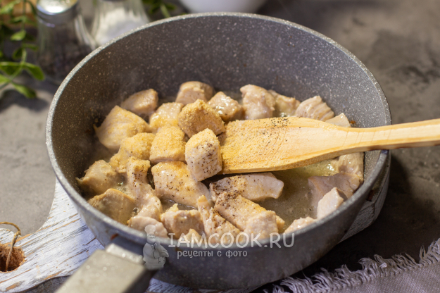 Выложите в сковороду с оливковым маслом и жарьте несколько минут, пока кусочки курицы не побелеют. Добавьте к курице сушеный чеснок, соль и черный молотый перец и готовьте при среднем нагреве минут 5-7, периодически помешивая.