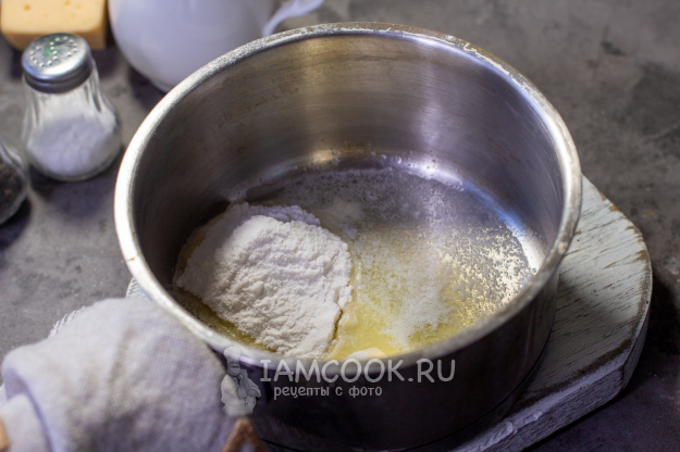 Пока жарится курица, параллельно поставьте вариться макароны. А также приготовьте соус "Бешамель". Для соуса в подходящую посуду с толстым дном добавьте сливочное масло, растопите его и добавьте муку. Обжарьте муку до легкого кремового цвета.