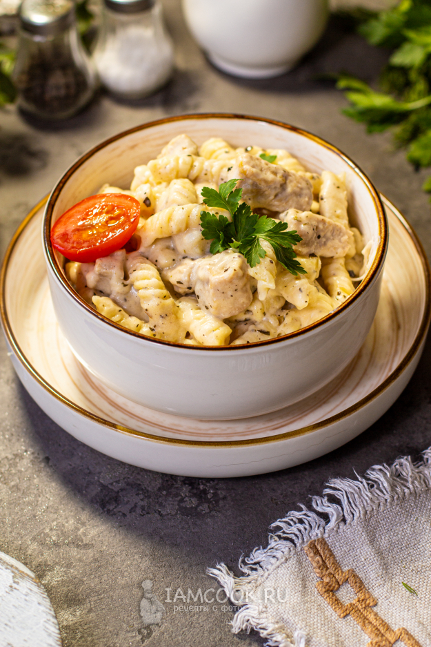 Соберите необходимые продукты для приготовления макарон с соусом "Бешамель" и курицей.