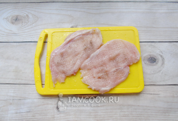Куриные грудки нарежьте вдоль на тонкие пласты, которые немного отбейте.