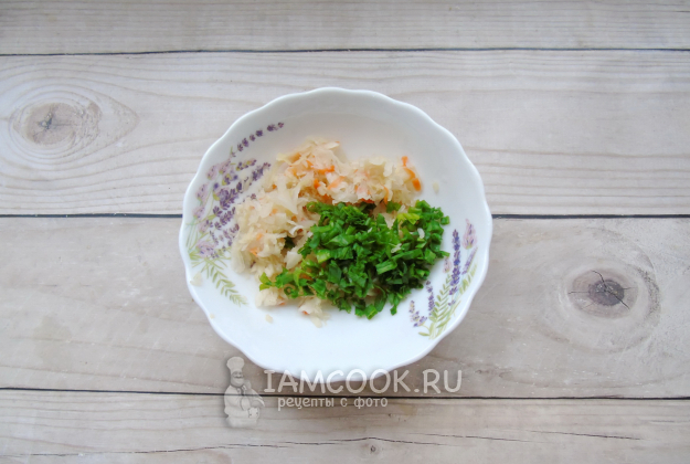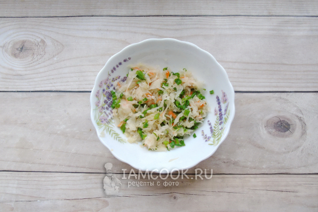 Приготовьте начинку для рулетиков. Квашеную капусту выложите в миску и добавьте нарезанный зеленый лук. Если капуста жесткая, то выложите её в сковороду, налейте несколько столовых ложек воды, накройте крышкой и тушите 10-15 минут, до мягкости.