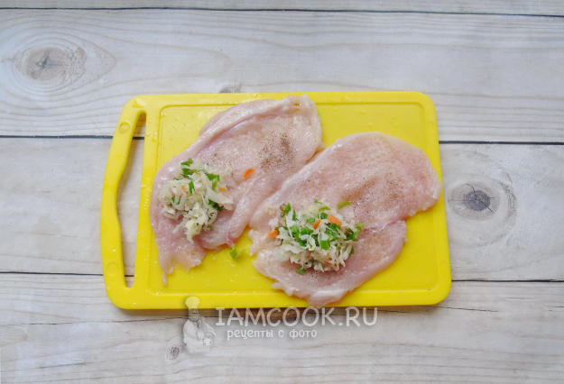 На пласт куриного филе выложите начинку.