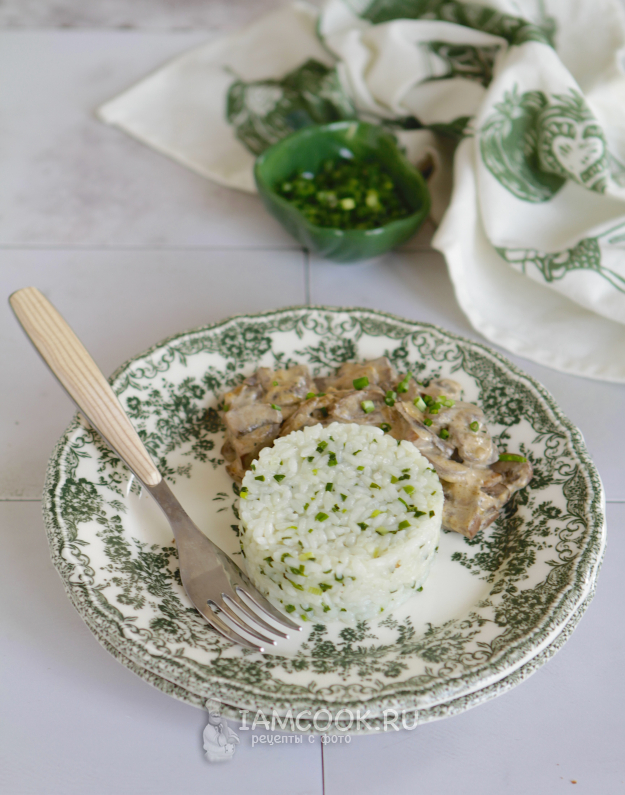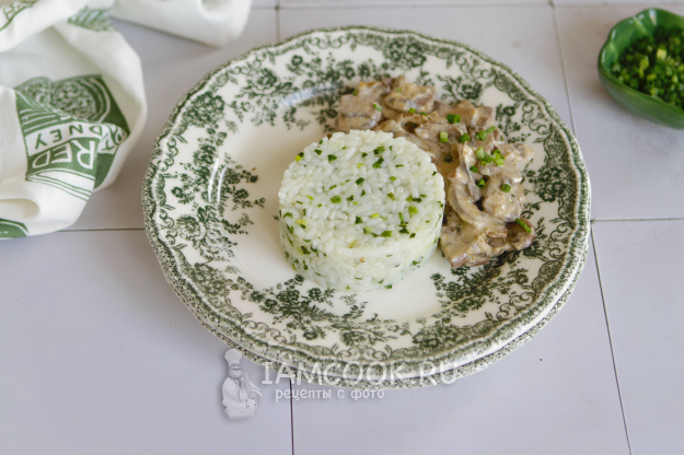 Или в качестве гарнира к любым приготовленным блюдам. Я подавала рис шампиньонами. Грибы тушила в сливках.