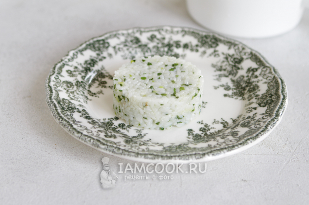 Когда будет готов рис, добавить к нему зеленый лук и перемешать. Сотейник закройте крышкой и дайте подружиться рису с луком и маслом.
