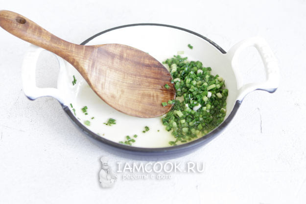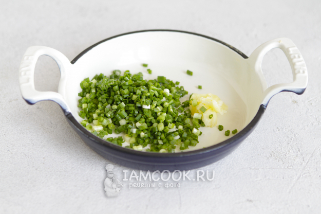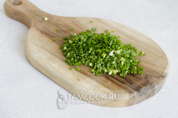 Хороший пучок зеленого лука, примерно 30-40 г, промыть и обсушить бумажным полотенцем. Мелко нашинковать.