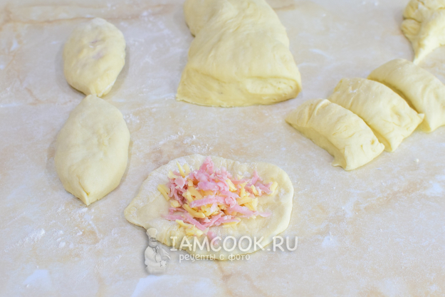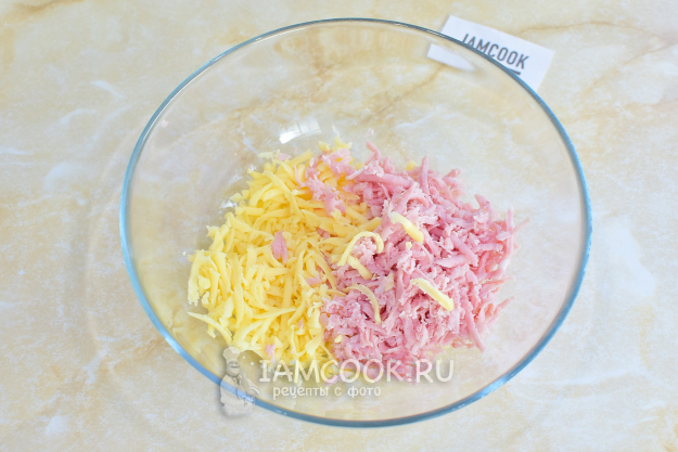 Для начинки потрите на терке ветчину и сыр. Перемешайте.