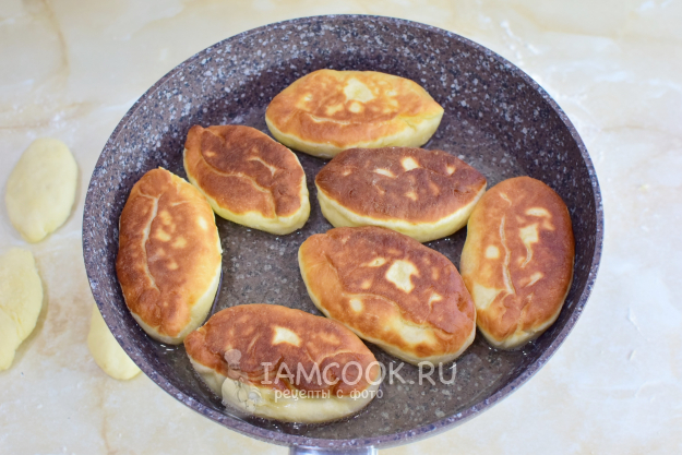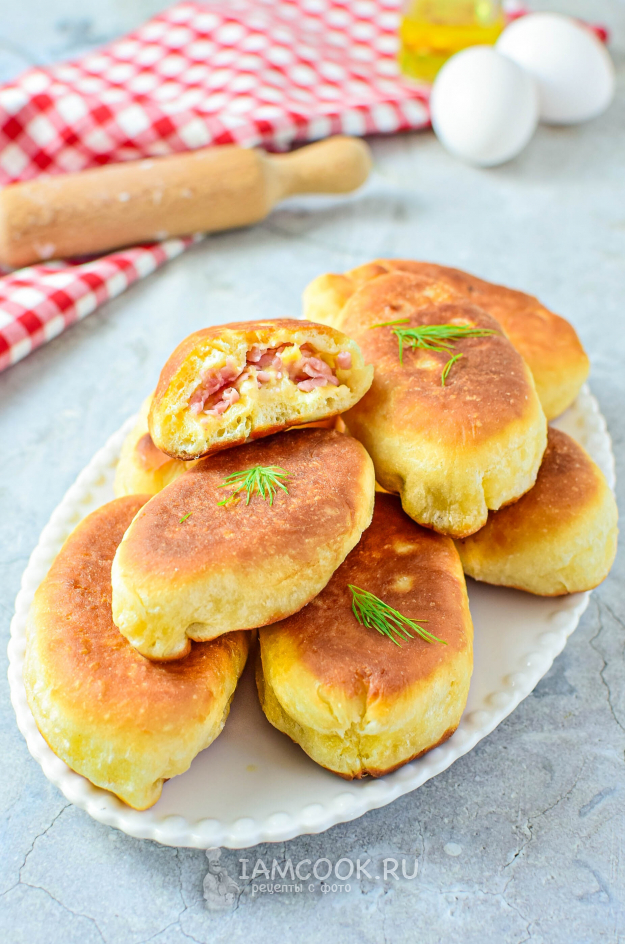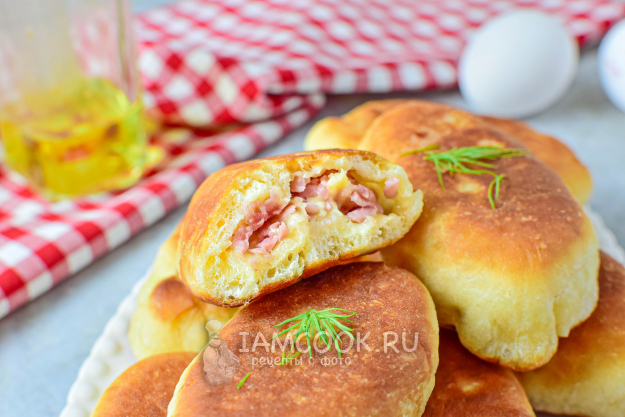 Пока вы слепите все пирожки, первые слепленные уже успеют немного отлежаться. На сковороду налейте растительное масло и готовьте жареные пирожки с ветчиной и сыром на сковороде на небольшом огне со всех сторон. Готовые пирожки складывайте в чашу и накрывайте полотенцем.