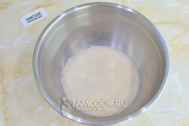 Для приготовления теста налейте в чашу теплое молоко. Добавьте к нему сухие дрожжи, сахар и соль. Смешайте.