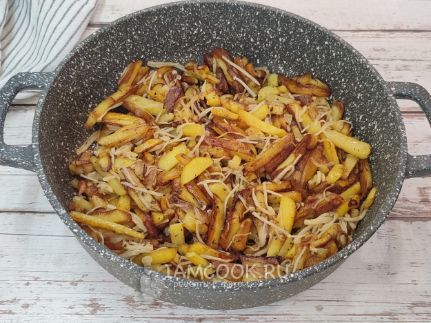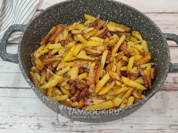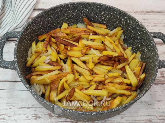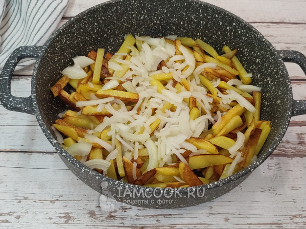 Спустя пару минут перевернем, чтобы лук оказался под картошкой.
