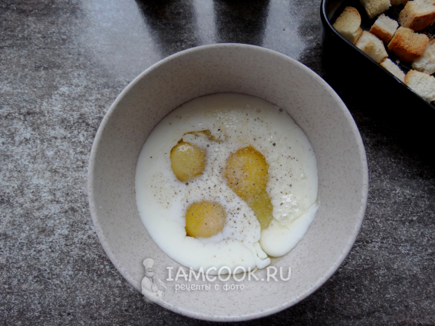 Яйца разбить в миску, добавить молоко, соль и перец по вкусу.