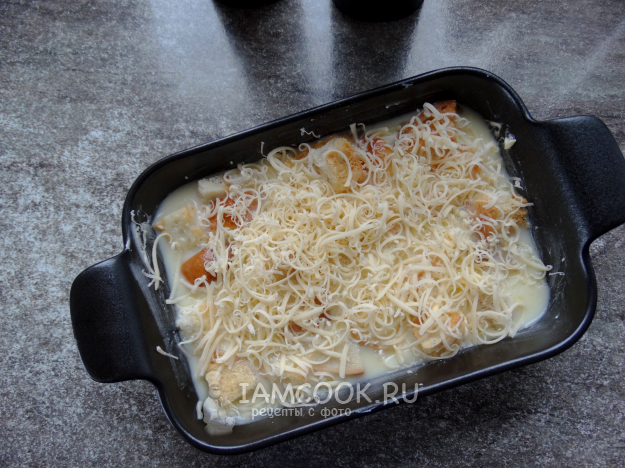 Вылить яичную смесь в форму. Посыпать сверху тёртым сыром.