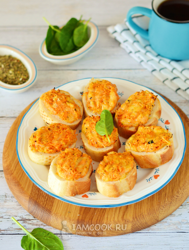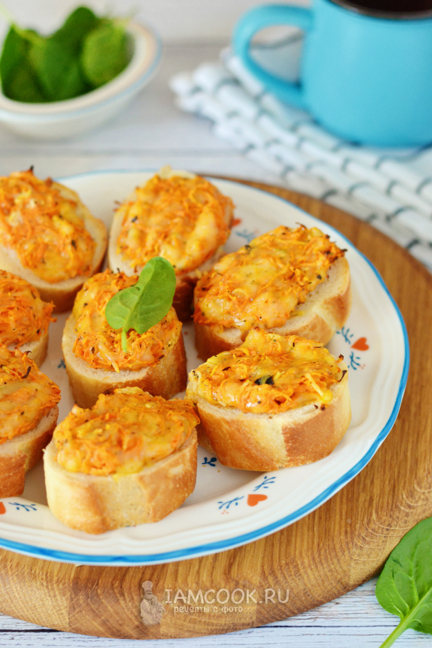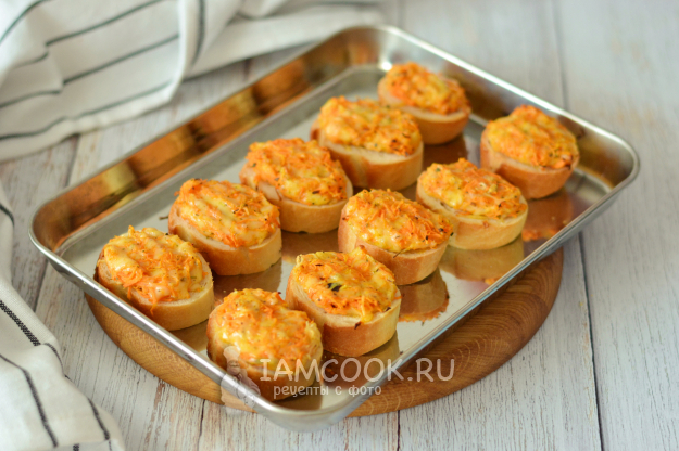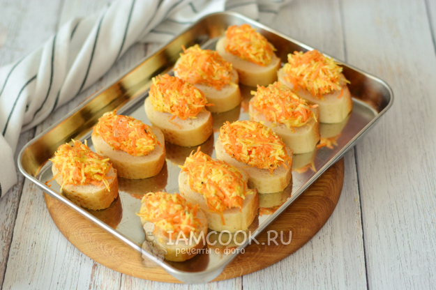 Кусочки багета разложите на противень. На них выложите морковно-сырную массу. Удобнее это делать руками, формируя небольшие комочки.