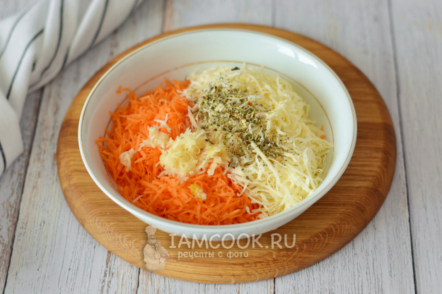 На мелкой тёрке натрите сырую морковь, сыр и зубчик чеснока. Добавьте сухие травы или любые специи на своё усмотрение.