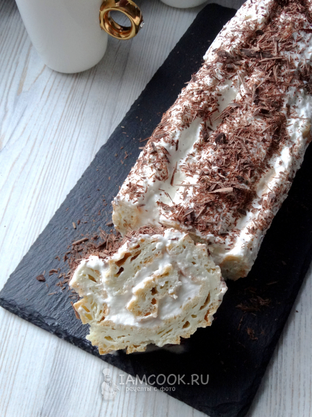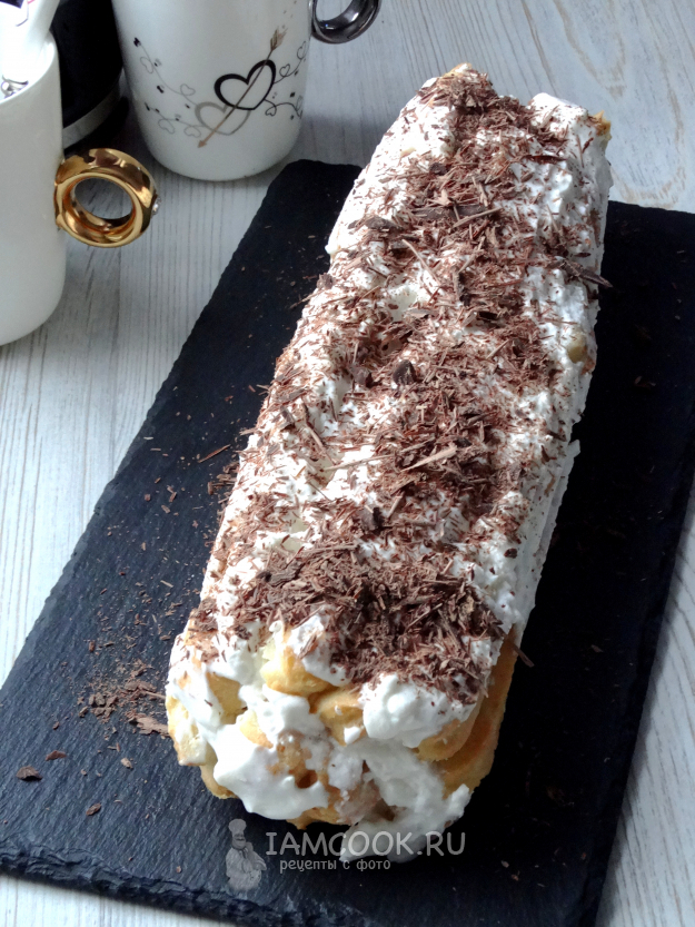 Рулет-эклер я покрыла кремом и посыпала тёртым шоколадом.