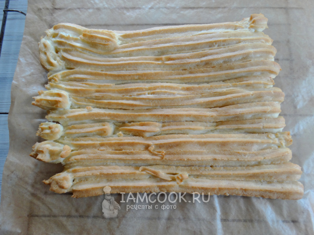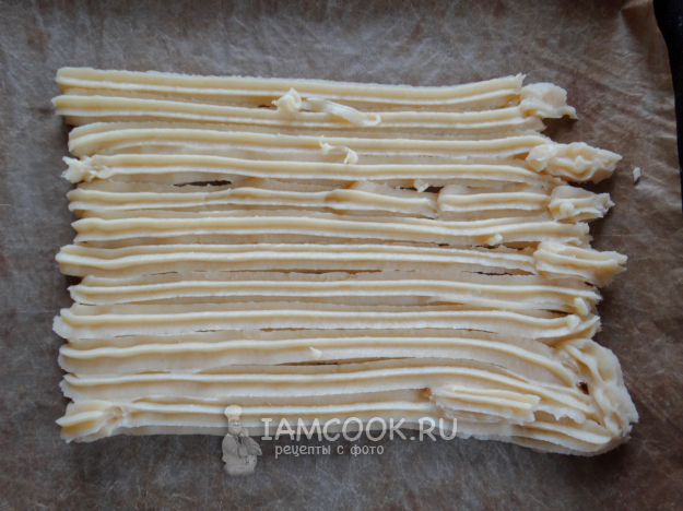 Отсадить тесто полосками на противень с ковриком или бумагой для выпечки.