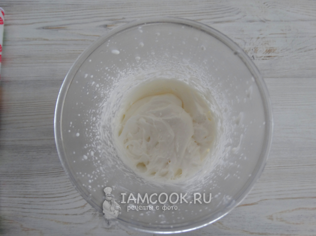 Холодные сливки, сыр и сахар взбить до устойчивого крема.