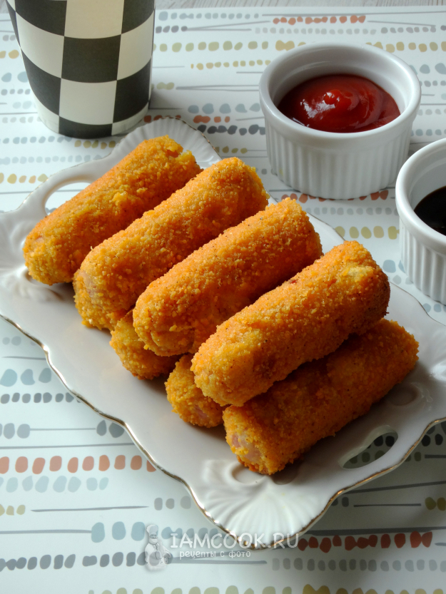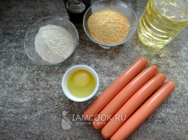 Сосиски в панировке на сковороде готовим из такого набора ингредиентов.