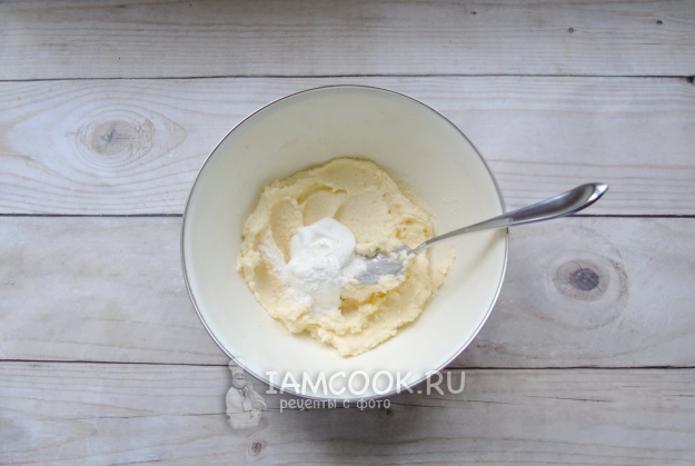 Тщательно перемешайте и добавьте сметану с разрыхлителем, щепотку соли, перемешайте.