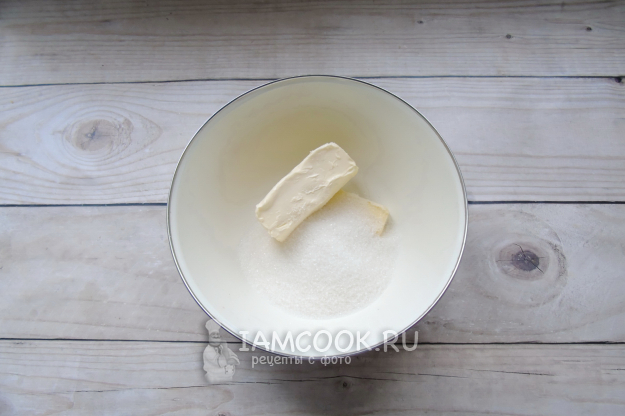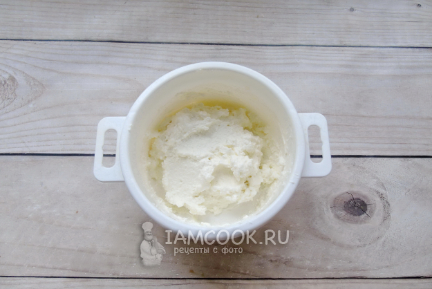 Творог перемешайте с сахаром и сметаной. А еще лучше взбейте погружным блендером.