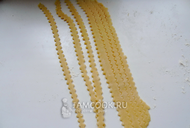Вторую часть теста раскатайте в пласт, который нарежьте полосками с помощью фигурного колесика или валика.