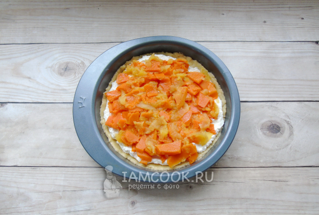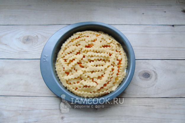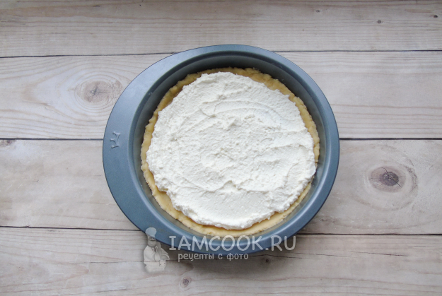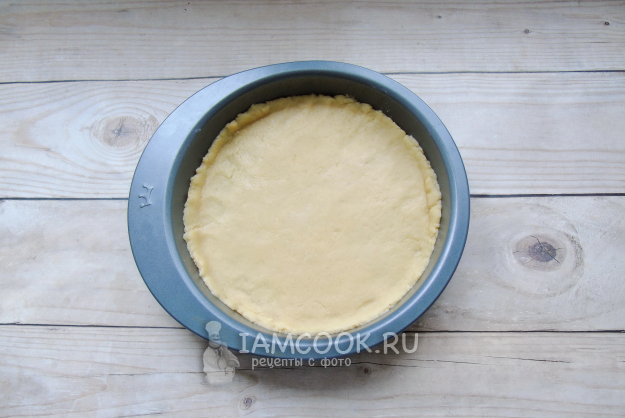 Тесто разделите на две неравных части. Большую часть раскатайте в круг и выложите в форму для выпечки.