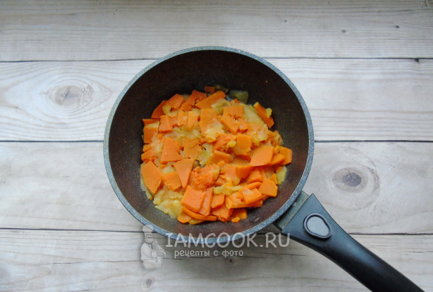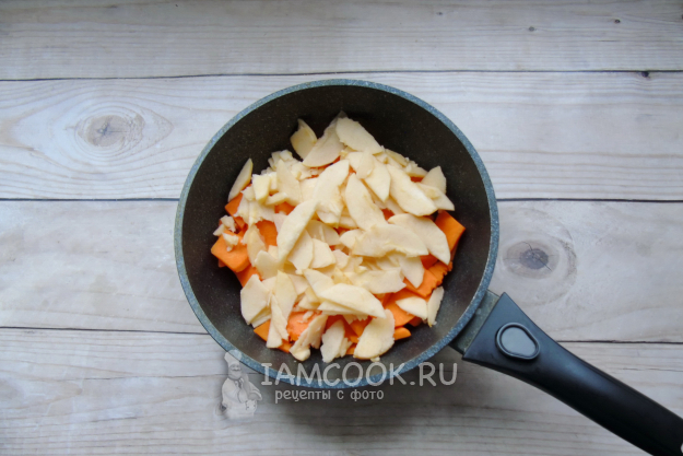 Тыкву с яблоками очистите и помойте. Нарежьте тонкими пластиками и выложите в сковороду.