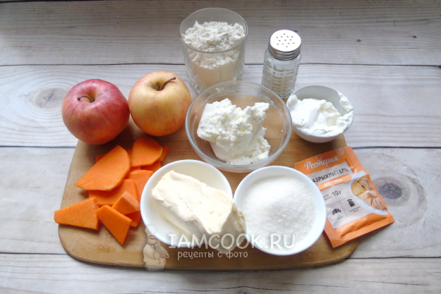 Соберите ингредиенты для приготовления песочного пирога с творогом, тыквой и яблоками.