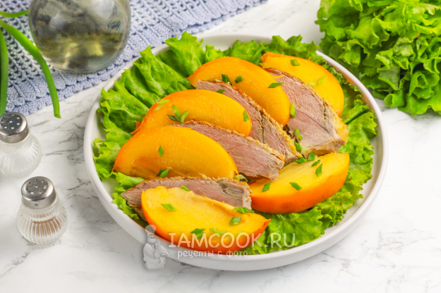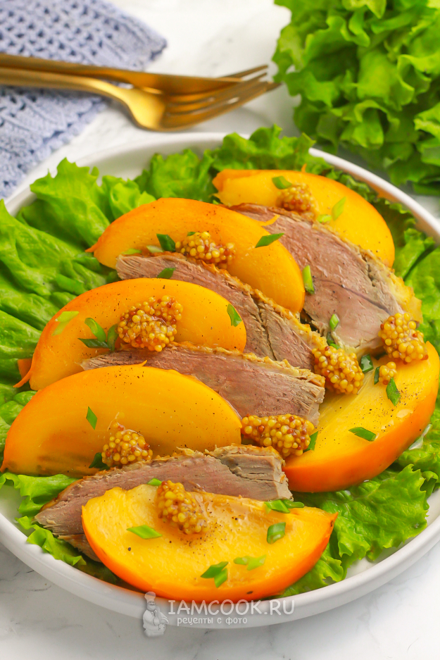 Подайте салат с хурмой и уткой к столу сразу же после приготовления.