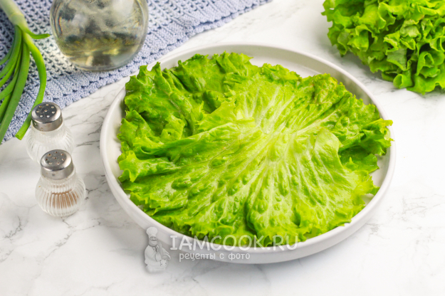 Промойте листья салата и стряхните их от лишней влаги. Выложите веером на тарелку или нарвите руками.
