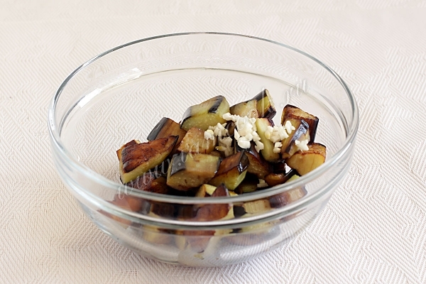 Затем переложить в салатник и полить соевым соусом, пока баклажаны еще горячие. Посыпать рубленным зубчиком чеснока и перемешать.